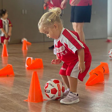 The sessions introduce young children to basic football skills—like dribbling, striking, and goal-scoring—using a blend of structured play and fun.